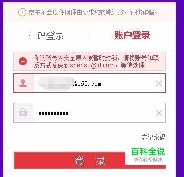 使用邮箱注册京东账号长时间不用被暂时封锁,登录用户名和密码,在用户名上方出现一行字。