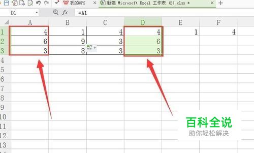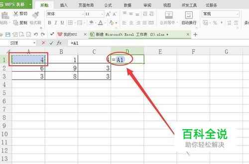 如下图所示左上角区域abc列,123行包含九个有数字的单元格,在d1单元格中输入=A1。