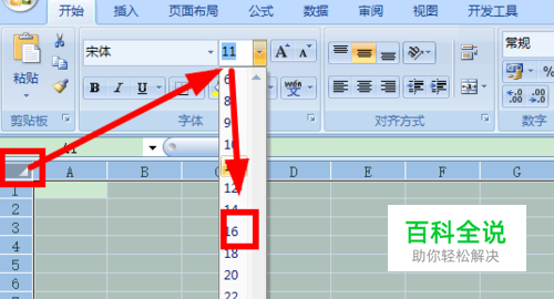 我们打开一个excel表格,发现它默认的字号只有11,很小,我一般习惯改一下字体, 比如我们这里改成16,当然不改也可以。
