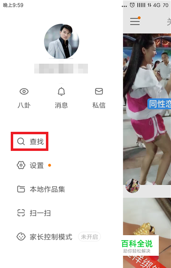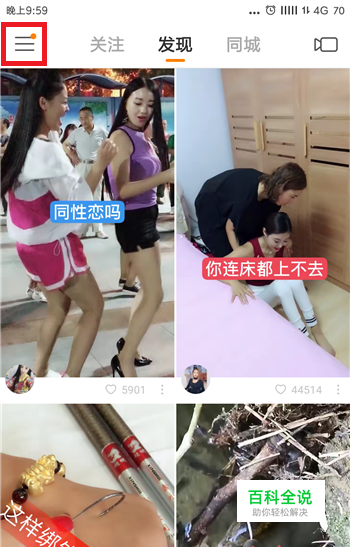 首先打开手机中的快手,在快手中点击左上角的【三】按钮,如图所示。