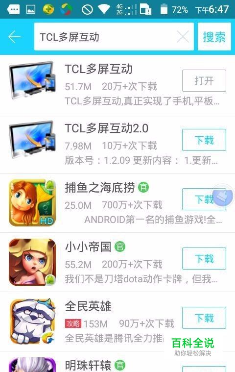 搜索TCL多屏互动,这时有上下两个选择上面那个。点击下载,安装。