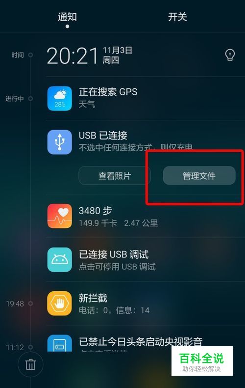 将华为手机通过数据线连接电脑,在其后跳出的对话框中点击管理文件。