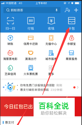 首先我们需要打开支付宝app,如下图搜所示进入支付宝的首页页面。进入首页后并点击我的卡包,在页面的右上角。