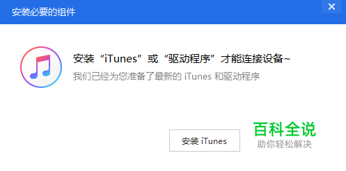 电脑成功安装好ai思助手后,我们点击将其打开,可以看到弹出提示框,说需要安装iTunes才能连接设置,我们将iTunes下载安装到电脑