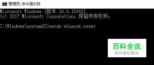这时会打开命令提示符窗口,在窗口中输入命令netsh winsock reset,然后按下回车运行该命令