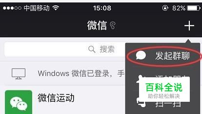 打开手机微信首页,点开右上角的+号,然后点开 发起群聊