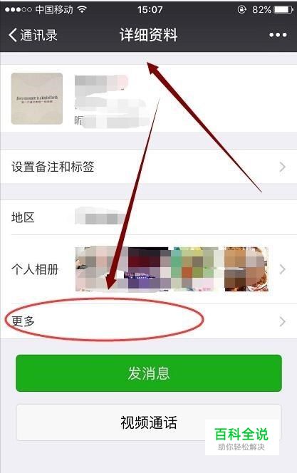 比如你要找跟你其中一位微信好友共同聊过的微信群,那么打开这位微信好友的详细信息,点开个人相册下面的 更多,如图