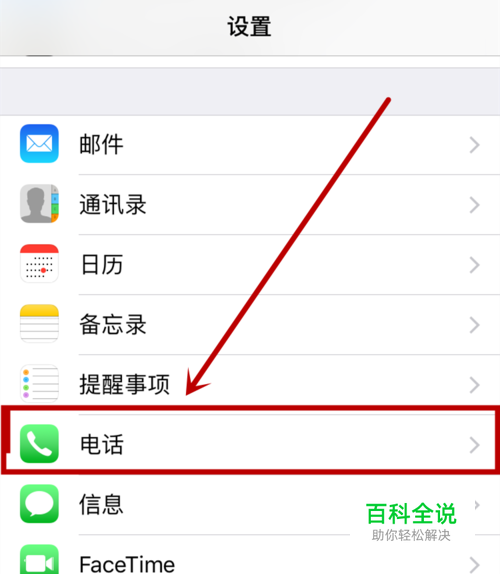 首先我们打开苹果手机的设置中心,进入设置中心以后 找到“电话”选项 并点击打开,如下图所示。