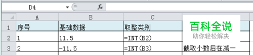 TRUNC函数取整:该函数取整的方式也是截取掉小数部分进行取整,与INT函数不同的地方为,对于负数,该函数也同样直接截取掉小数部分取整。