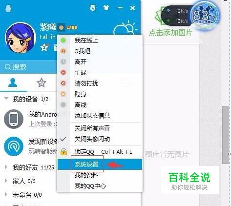 如果按以上三个键,没反应,QQ图标还是没出来,但是可以打开QQ面板,我们就可以点QQ名字后面的小三角,找到“系统设置”命令;