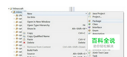 首先你需要建立一个包(Package) Package的命名很随意,Forge建议的命名规范是"作者名.mod名”,Java建议的命名规范是Package的制作公司的网站的域名的倒写,例如"com.lofter" 实际上无需在这个问题上纠结这个教程里使用了“作者名.mod名”的命名规范,毕竟不是谁都有一级域名的。 右键项目中的minecraft,选择New->Package来创建一个Package。