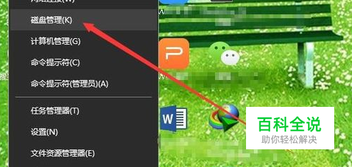 右键点击桌面左下角的开始按钮,在弹出的菜单中选择“磁盘管理”菜单项。