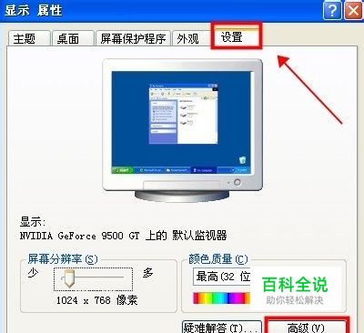 进入高级设置之后,弹出“默认监视器 和 NVIDIA GeForce 9500 GT 属性”,然后找到“疑难解答”,把“疑难解答”下面的“硬件加速”的滚动拉条往右调到最大,然后点击“确定”保存就OK啦!