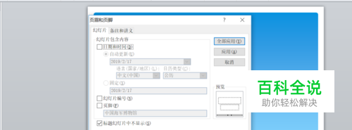 如果只需要插入幻灯片编号,则只需要勾选幻灯片编号即可,点击全部应用。如果第一页标题幻灯片不显示,则可勾选标题幻灯片不显示