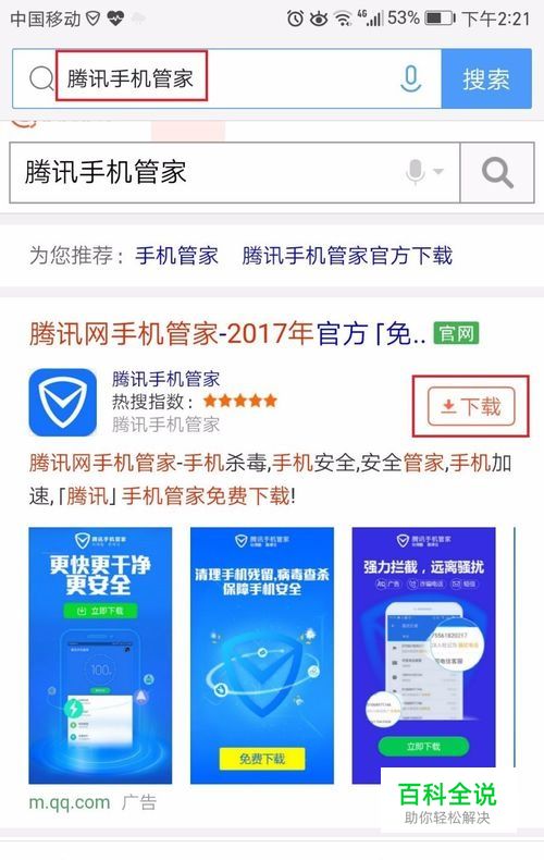 如果你的手机没有安装腾讯手机管家,首先要安装“腾讯手机管家”,在浏览器中搜索“腾讯手机管家”,我们将找到最新版本的“腾讯手机管家”软件,点击“下载”