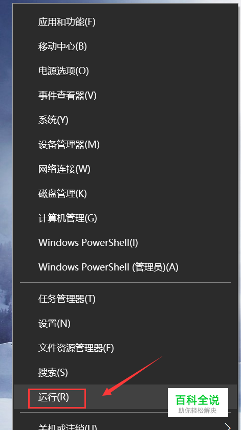 在开始右键菜单中点击运行,如下图所示