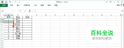 然后利用excel的填充功能,往下拉,让表格的序号列填满;