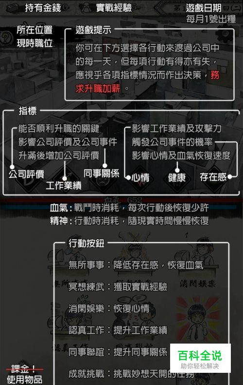 在公司中,首先要和同事打好关系。同事关系会有一定的几率影响你的升职,在和同事关系很好的时候,就算公司评价是C也是可以升职的。公司左上角就是你的职位,职位的高低决定了你的工资多少,工资的多少也决定了你后续的修炼。所以玩家们还要做好业绩,当业绩满后也是有可能升职的。总的来说,在公司就是为了挣钱。