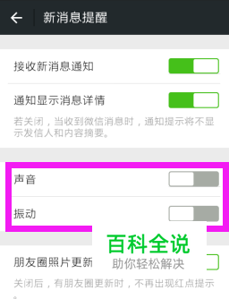 进入新消息提醒设置页面,可以看到,声音和振动后面的方框是绿色的,点击该绿色方框。