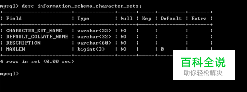 还可以利用information_schema.character_sets,查看显示所有的字符集和字符集默认的校对规则,利用命令: desc information_schema.character_sets; 如下图所示:
