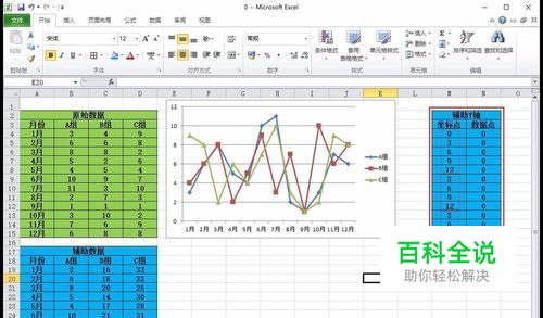然后按照下图中的方式在Excel表格中输入 三组坐标点和数据点,分别是0、3、6、9、12,3、6、9、12和3、6、9、12,数据点均为0;下面选中辅助数据,点击“ 插入>折线图>带数据标志的折线图”,绘制出原图图形,并选中其 纵坐标,按“Delete”键删除掉,如图所示。