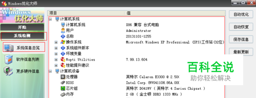 使用优化大师查看,假定电脑已经下载安装成功Windows优化大师,打开软件,点击系统检测,查看系统信息总览,即可在右边显示电脑硬件配置。