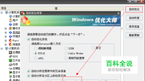 检测优化配置点击自动优化,按步骤确定即可自动优化电脑配置。