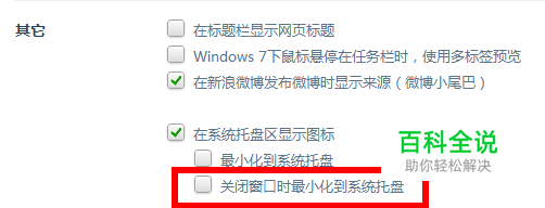 从360浏览器右上方找到“工具”,点击后依次进入“选项”——“高级设置”,在“其它”里,把“关闭窗口时最小化到系统托盘”前面的√点击取消即可。如下图所示: