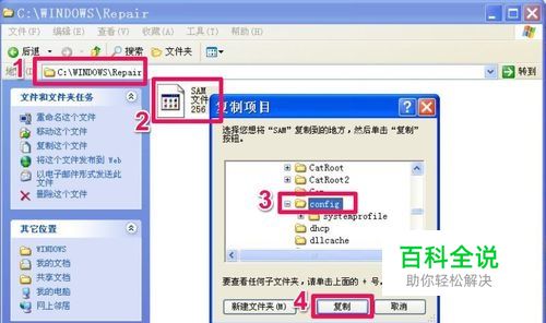 等切换目录成功后,再输入下一条copy c:\windows\repait\sam命令,按Enter键回车。 这条命令的意思是,把c:\windows\repait\文件夹下的sam文件,复制到当前文件夹(即替换c:\windows\system32\Config文件夹下的SAM文件)。 替换完后,重启电脑,就能进入系统了。