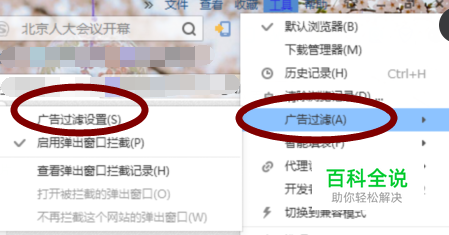 然后再工具下方会出现下拉,执行“广告过滤——广告过滤设置”。如图