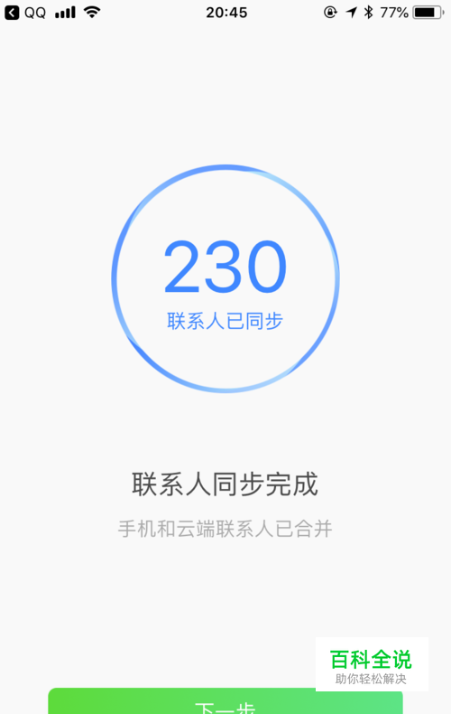 根据提示,将通讯录同步到云端,按照如图所示操作,最后点击下一步完成备份