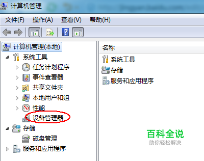 在“计算机管理”窗口的左侧找到“设备管理器”并单击进入