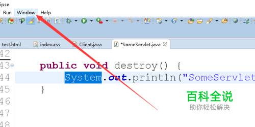 在eclipse中找到window,并点击。window的位置如下图所示,找到它并点击即可:
