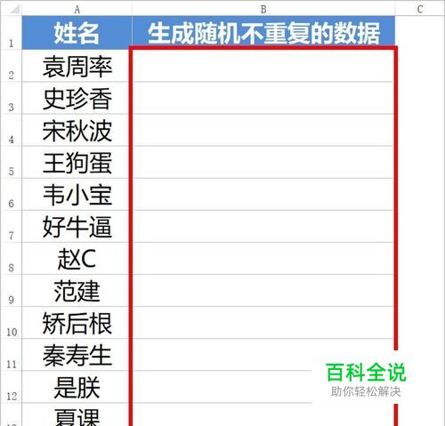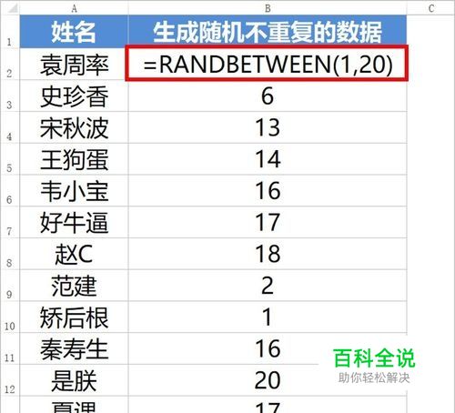 我们这里假定要 在B列生成20个随机且不重复的数据,然后根据随机计算的结果给A列的姓名进行排序及分组。