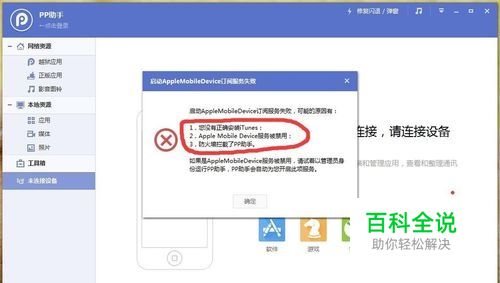 苹果手机连接pp助手,itunes,91助手等,这些软件的时候,会出现连接失败的提示,今天交大家如何解决,其实挺简单的!~