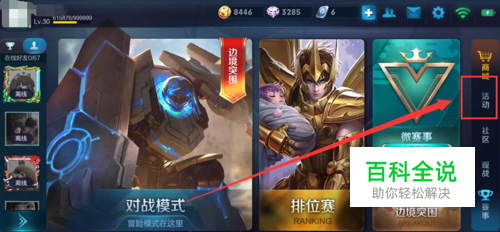 首先在手机上打开游戏——王者荣耀,在游戏主界面点击右侧——活动,进入活动页面; 如下图所示: