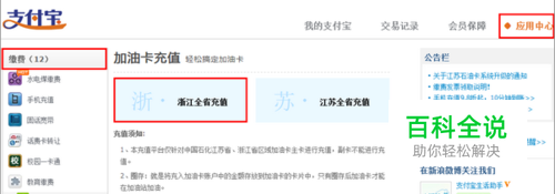 登录支付宝账户, 应用中心—缴费, 点击加油卡充值以浙江省充值为例