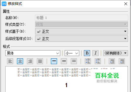 此时调整各种要求的格式【比如,字体:黑体,字号:小一,格式:居中加粗(还有行间距,上下段距离等等)】,都对其进行相应的设定。 (如果标题有文字又有字符,需要选择“所有脚本”对整个标题进行设定,以免两者格式不一样) 设定好后一般选择保存到模板,方便下次使用,点击确定。弹出对话框也点击确定。