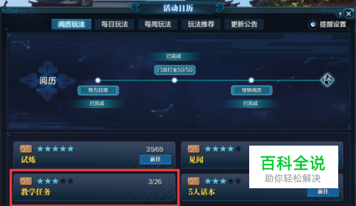 在玩法推荐中,我们打开“活动日历”能看到教学任务和其他三项略有不同,操作难度为三星,但没有“前往”直接打开的按钮,很多新手玩家不知道怎样完成。那么,下面跟大家讲解下这个“教学任务”的玩法。