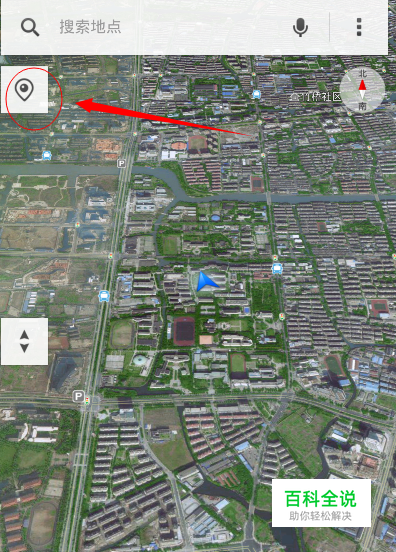 然后将其打开,选择地图的卫星地图格式或者其他格式也可以。 然后点击小摄像头的标志。