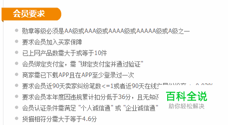 勋章登记必须是A级以上,1A,2A,3A,4A,5A 商家必须已加入买家保障 商家在线商品数大于等于10件 商家绑定支付宝并通过验证 下载阿里巴巴APP并登录一次以上 近90天的纠纷笔数小于等于1或近90天在线交易纠纷率小于等于0.03% 商家年度违规分低于36分,且没有知识产品严重侵权情形 商家必须是企业诚信通会员 货描大于等于4.6分 发货速度大于等于4.3分 商家登记必须是A或AA或AAA或BBB之一 商家APP店铺已装修好