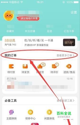 打开手机淘宝,点开 我的淘宝页面,然后点开 我的订单