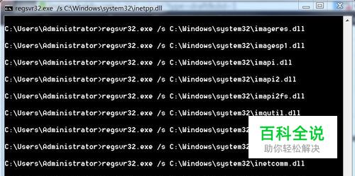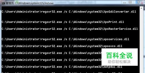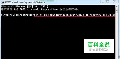 2) 在命令提示符下输入下面命令: for %1 in (%windir%\system32\*.dll) do regsvr32.exe /s %1 回车。到屏幕滚动停止为止。 (如果怕输入有误,可复制-粘贴。方法是:复制指令,点击窗口左上角“管理员”左边的小框-编辑-粘贴)