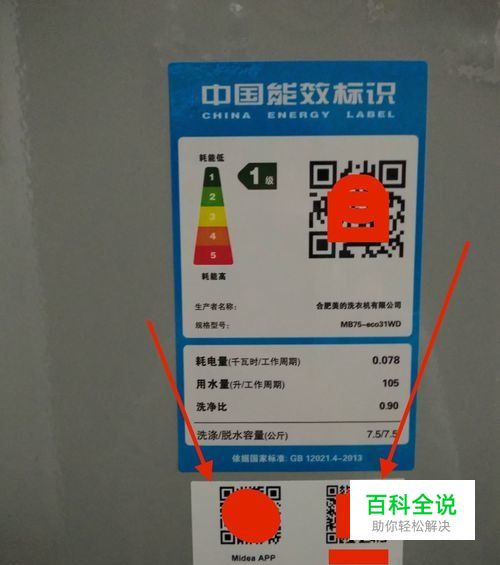 在洗衣机机身的一侧能够找到app的下载地址和该机的唯一编码信息,箭头左侧为app的二维码标志,右侧为该机的唯一编码信息;