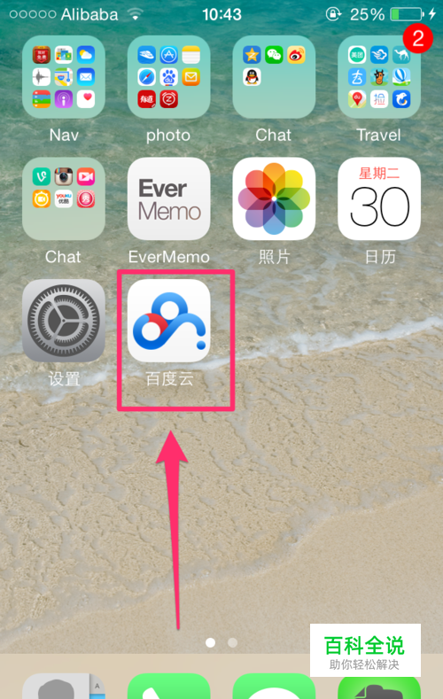 打开自己的iPhone主界面,从应用程序中找到“百度云”客户端,并点击进入下一步。