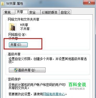 文件夹属性中,找到共享,点击下面的共享下面的第一个按钮