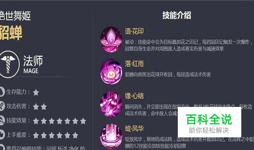第一步呢,我们先来分析一下貂蝉这个英雄的技能,根据技能特效我们来预谋走位技巧。“语 花印”,四层印记叠加触发爆炸,对敌人造成伤害并减速;“落 红雨”,一朵花束造成简单法术伤害;“缘 心结”,瞬间一段位移,三朵花束带有技能冷却效果;“绽 风华”,结成大阵,叠加印记,阵内12技能冷却减慢。多数减速,冷却缩减,法伤叠加,使得貂蝉成为近战法师的强力存在。
