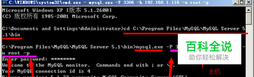 使用cd切换到msyqld.exe路径下,然后输入mysql连接命令如下图 格式是: Mysql -P 端口号 -h mysql主机名\ip -u root (用户) -p