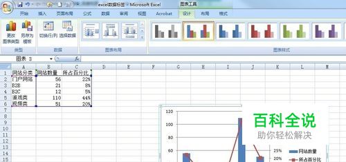步骤3、在折线图上将出现百分比数据标签,同样的操作方法可以在柱状图上添加数量数据标签,参见下图;