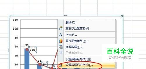 步骤4、再次在图表折线上点击鼠标右键,在弹出的快捷菜单中,鼠标左键点击“设置数据标签格式”;